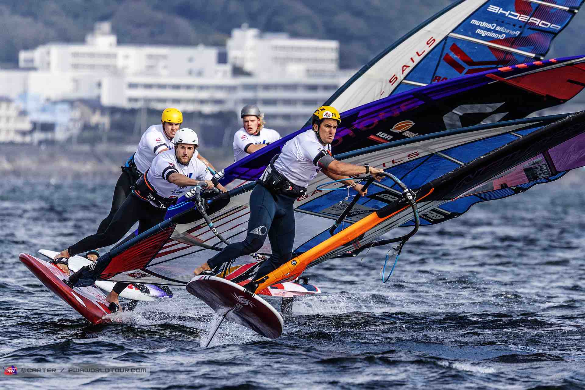 大会4日目。今日は朝から強い風は見込めず、沖合では4~9ノット程度。8時半のスキッパーズミーティングでも様子見の空気が漂い、このままウェイティングが続くかと思われた。しかし9時頃には、レースエリアで6~12ノットと徐々に風が上がり始めた。これを受け、運営サイドは急遽9時15分に最初のスタートを試みる判断を下し、昨日の続きとなる Elimination 2・男子第7ヒートから競技が再開された。選手達は手持ち最大サイズのセイルでレース海面へと向かっていった。このコンディションでは、わずかに風が落ちただけでノーレースとなり、再スタートが繰り返される可能性もあった。昨日も同様だったが、昼頃に風が落ちることが予想されていたため、レース進行は無駄のないスピーディーな運営が徹底された。レースはこの日も、海外選手の圧倒的なスピードに日本選手が苦戦する展開が続いた。スタートのタイミングやマーク回航、失速後の立て直しなど、分かっていても競り合いの中で対処するのは容易ではない。それだけに、海外勢の技術の完成度の高さが際立つ一日となった。その中でも、男子は DEN-37 ヨハン・ソー、ITA-140 マッテオ・イアキーノ、F-14 ピエール・モーテフォン の3選手、女子は F-171 ジャスティン・ルメティエ、SLO-51 リナ・エルゼン、E-3 ブランカ・アラバウ の3名が、不動の上位集団を形成している。国内勢では、女子の JPN-311 穴山未生 が Elimination 1 に続いて Elimination 2 でも決勝進出。さらに Elimination 3 では JPN-4 新嶋莉奈 が決勝へ駒を進めた。この日は、男女とも Elimination 3 をあと一歩というところまで消化したが、男子はセミファイナルとファイナル、女子はファイナルを残し、勝負の行方は最終日へ持ち越されることとなった。
